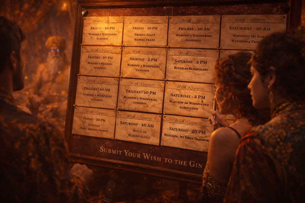 Once the wishes are gathered, the Gin assigns each one a specific time slot during the weekend. Those time slots are listed here as well. When that hour arrives, that fantasy is given its space so it does not spill into other activities or hijack the rhythm of the weekend. It burns in its moment, and then it is done